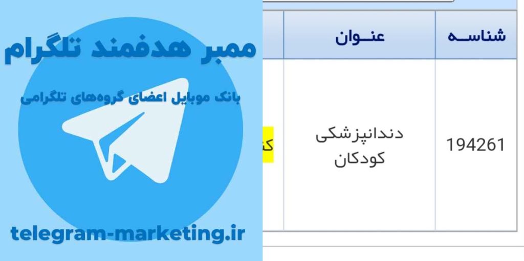 عزیزانی که در گروه وبیناردندانپزشکی کودکان ۲/۲۵ عضو هستند، در گروههای زیر نیز اکثرا عضو هستند که علاوه بر اینکه میتوانیم این افراد رو به گروه شما اضافه کنیم، امکان ارسال فایل اکسل شمارهها از عضوهای این گروهها نیز امکان پذیر هست. جهت درخواست بانک موبایل از اعضای گروه وبیناردندانپزشکی کودکان ۲/۲۵ و یا هر گروهی که مدنظرتون هست، لطفا عبارت لیست شماره موبایل رو در تلگرام به شماره ۰۹۱۲۱۴۰۰۲۳۷ ارسال فرمایید.